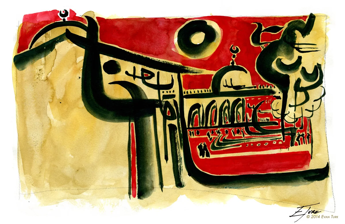 A city of conflict and history. Drawings from the Western Wall, Church of the Holy Sepulchre, and Haram al-Sharif.